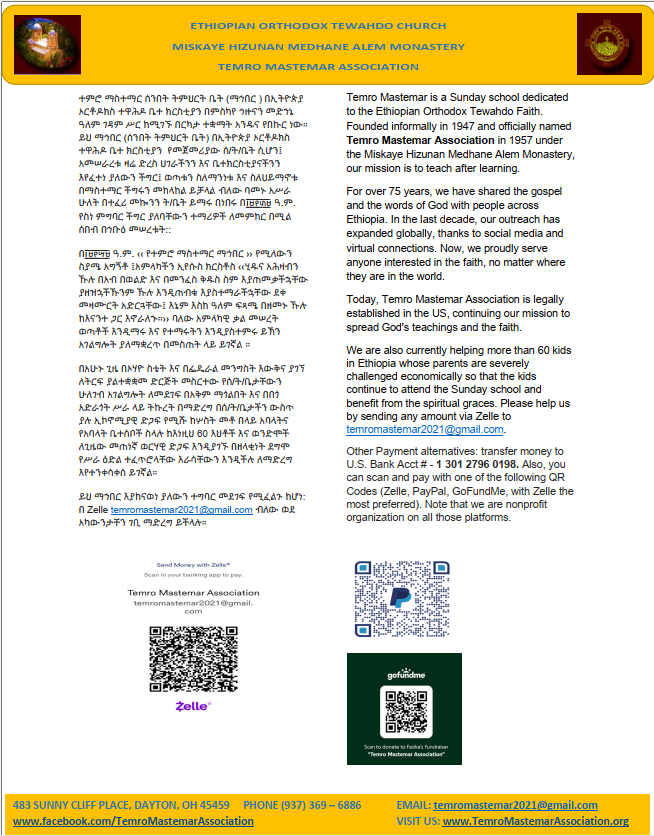 Temro Mastemar is a Sunday school in Ethiopian Orthodox Tewahdo Faith under Miskaye Hizunan Medhane Alem Monastery. It was founded in 1957 under the name of “Temro Mastemar Mahber”, Amharic (one of Ethiopian major languages) name, meaning “Temro Mastemar Association”. The association has been spreading out words of God and gospel to the faith all interested focusing in Ethiopia for the last 60 years. In the last decade, as social media and virtual connection have become more reality and as the world has become smaller and smaller, the outreach of the association has also become borderless and started serving anyone interested in the faith internationally. Today, it is having its legal existence in US, to help the spread of God’s words and the teachings of the faith.
